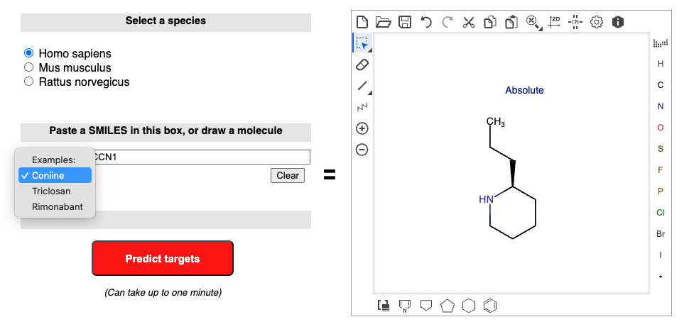 The input page allows you to submit a query molecule either by writing/pasting the SMILES in the input text box, or by using the molecular sketcher on the right for drawing/importing any molecular structure.The content of the text box and the sketcher are synchronized.