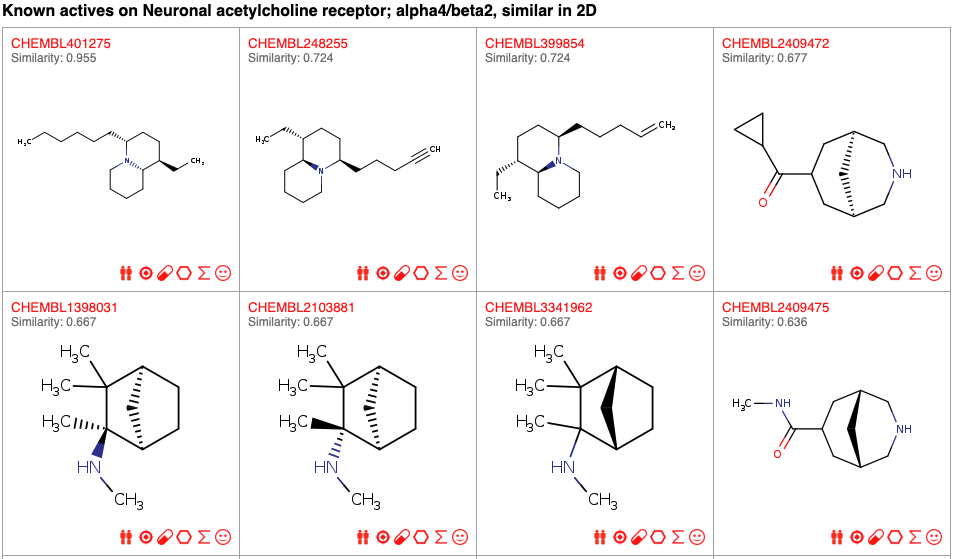 This page displays the compounds, which have driven the prediction for a given protein as target of the query molecule. These compouds are experimentally defined as actives on the target under investigation (here, the subunits alpha4 and beta2 of the neuronal acetylcholine receptor) and highly similar to your query molecule based on 2D (in this example) or on 3D simlarity measures. Each active is identified by its Chembl ID (clickable link to ChEMBL) and similarity values are indicated below.When predictions are made by homology (i.e., compounds most similar to the query molecule are known actives on a homolog of the predicted target), the actual protein target is also shown.